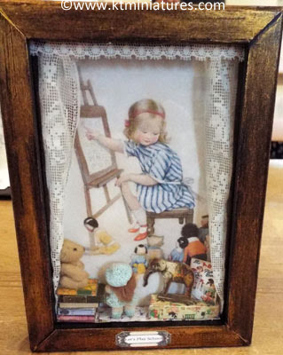 Some of those KT Miniatures handmade items include a fixed arrangement of antique toy bricks, a 1930s colouring book, dog on wheels and some of my old books. The toy sailor has been artisan made but I have had it for so long tucked away in a box, that I have now forgotten who made it (apologies to the artisan)!